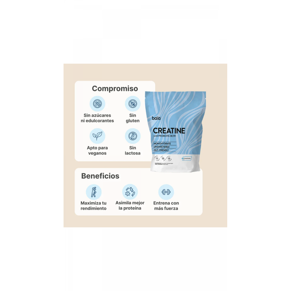 Suplemento de creatina micronizada con probiótico Weizmannia coagulans BC99 que potencia la absorción de aminoácidos, mejora rendimiento físico y mental, facilita la recuperación y maximiza la utilización de energía muscular. Apto para entrenamiento diario y actividad física exigente.